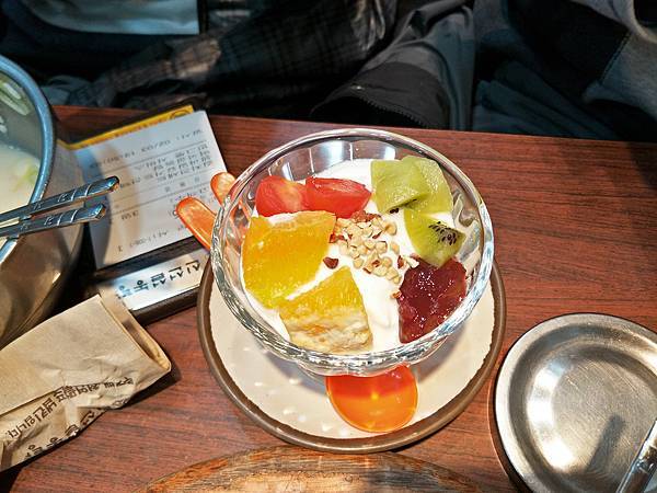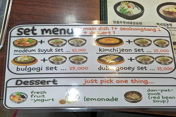 另外有小單張的套餐組合,我們選了1個泡菜煎餅(原價10000₩)+2個雪濃湯(原價8000*2₩)+1個水果優格(3500₩)的組合,只要25000₩(約台幣700元),因為主餐剛好都是我們想點的,點套餐相當於甜點就是免費的啦!划算!