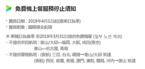 釜山航空是韓亞航空旗下的低成本航空,但有含行李和餐及選位。不過自2018年5月21日以後訂票的,免費托運行李從20公斤調整成15公斤;又自2018年7月9日以後訂票的,也不再提供免費選位(我7月4日訂票還可以選位);然後更進一步自2019年4月1日起(以搭乘日為準,而非訂票日),也取消免費機上餐了(我們3月31日去程剛好吃到最後一餐...)。我覺得取消機上餐釜航這樣做很不厚道,應該要像行李和選位一樣,以購票日期來區隔才對呀!本來我的票價就是含餐的,怎麼可以說不給就不給呢?