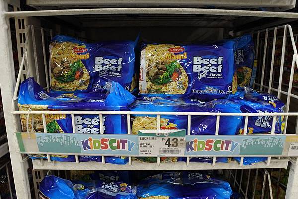 菲律賓泡麵超便宜,6小包一袋才43.8p,平均1小包才4元,大概跟我們的科學麵差不多大小。