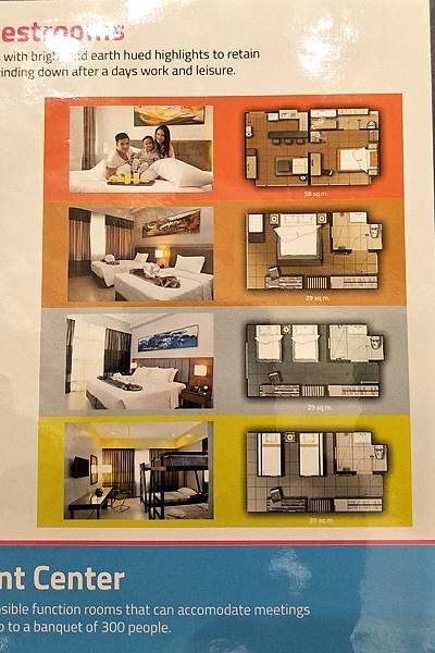 飯店的房型有4種,我原本訂的是最下面那排上下舖的4人房,一晚只要2668p,1616元。我原本預定的是最下面那種上下舖的4人房,但Check in時說什麼我房間的床壞了,所以要幫我換到第二排這種房型並免費加床;當時乍看這房間照片還以為是1大1小床的3人房加床也就接受了。進到房間才知道是給我雙人房加2床!因為同事前一個月跟團才住過這間,我看到他們房間只加1床的照片就已經很擠了,那加2床不就動彈不得了!?我不能接受!