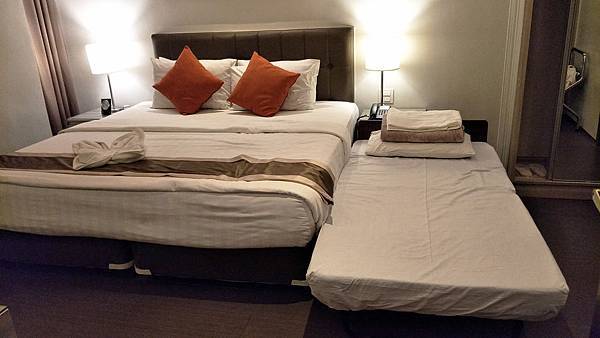 不想把房間搞得有壓迫感,只另外加1床而已。我一直要兒子跟櫃台確認是應該是要免費加床喔!