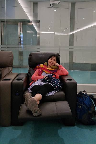 衝到登機門搶躺椅。還不錯,3張躺椅我們家就攻佔2張了,家裡兩位男士都禮讓給女士們,我們就謝過啦!