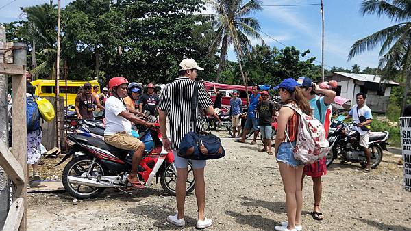 走出碼頭一堆摩托車、嘟嘟車和Multicab的車伕在招攬生意。