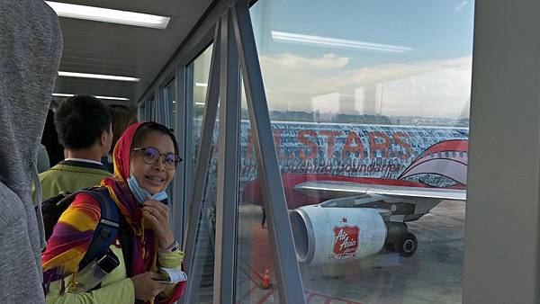 預定登機時間有點延遲,我們這次搭亞航還有空橋喔!而且機身還有紋身,貼了許多名人的圖像,很特別。