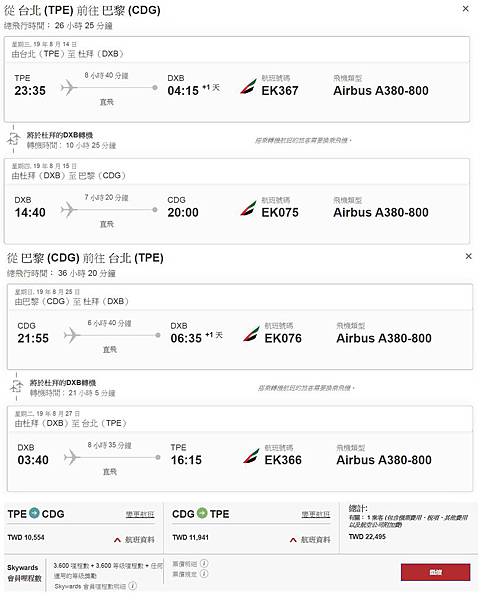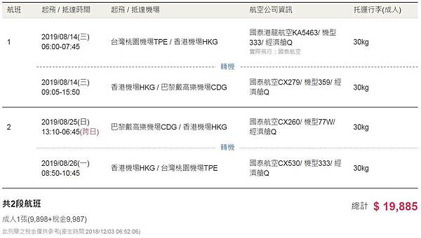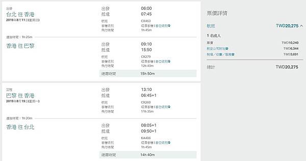 (沒想到最後我竟然不幸運到香港反送中事件,退掉國泰機票,買了比這個還貴2倍以上的價格從台北經杜拜轉機至奧斯陸、再從巴黎經杜拜轉機回台北;但又極其幸運的,4趟航程有1趟是全家升等商務艙、我自己則有3趟免費升等商務艙!)