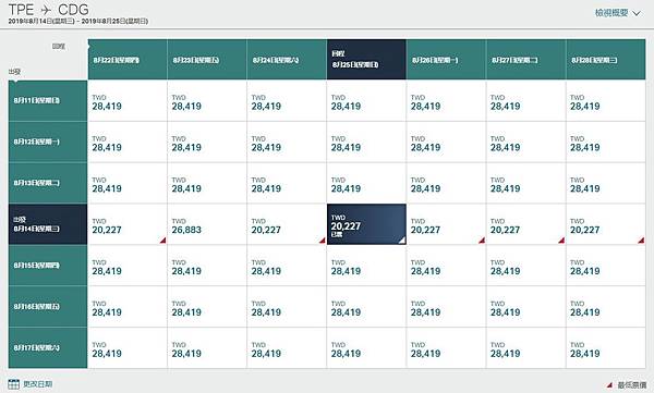 除了荷蘭、比利時有不到2萬的價格外,巴黎也只多個幾百元而已。不過跟倫敦一樣去程是早班機,回程又是午班機,時段不是那麼理想。不過隔了幾天才注意到,竟然8月中就有這種價格了!以往都要到8月下旬接近月底時才會出現的價格,竟然在8月中就可以出發了,還是很吸引人!跟好友分享後他們竟然隔天就下訂了,但才一個晚上,8/11已經沒位了,只剩8/14出發的。