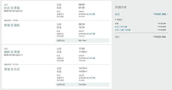 我立刻傳Message給孩子們,等等吃完飯要來查機票,歐洲哪裡便宜哪裡去。一開始直接上國泰官網查,荷蘭比利時都超過2萬5了,但倫敦才21702元,比上次查的25596元又便宜了快4千,而且是8月中出發的!