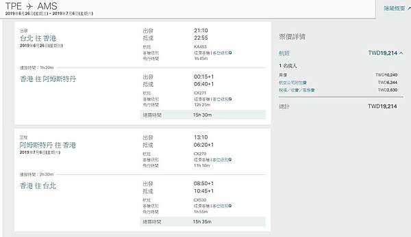 2018年11月意外發現2019年6月底飛荷蘭竟然還不到2萬!一樣很棒的晚班機航班!
