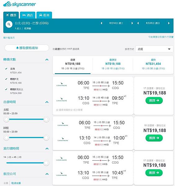 於是再上Skyscanner查一下確認價錢,意外發現最低價竟只要19188元!