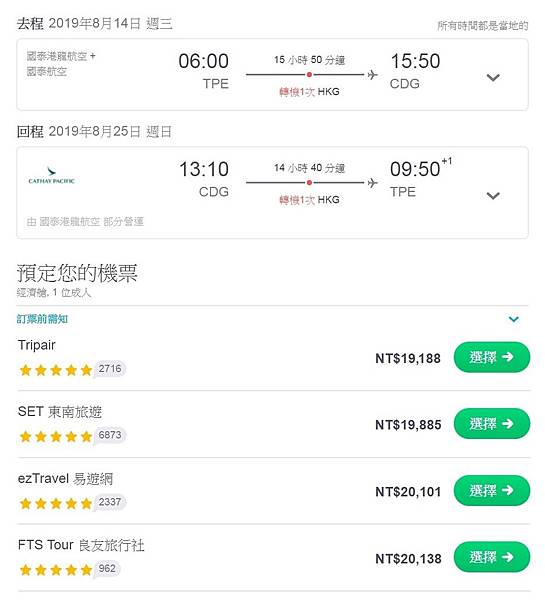 不過通常排名前幾名低價的都是國外或大陸網站,基本上再便宜我也不想自找麻煩;而第二名以後竟然都是台灣的旅行社!最便宜的只要19885元~~不到2萬耶!比國泰官網又省了342元!