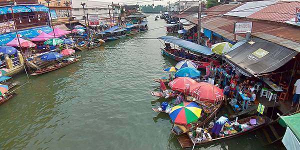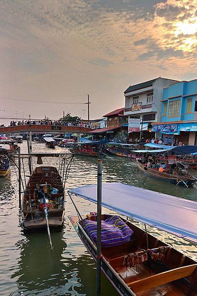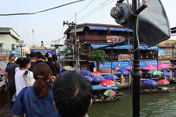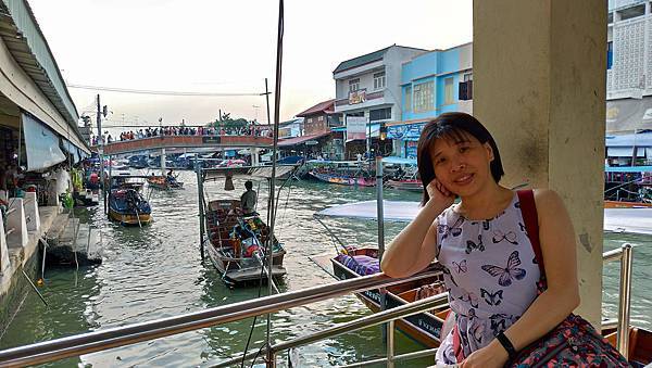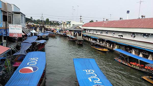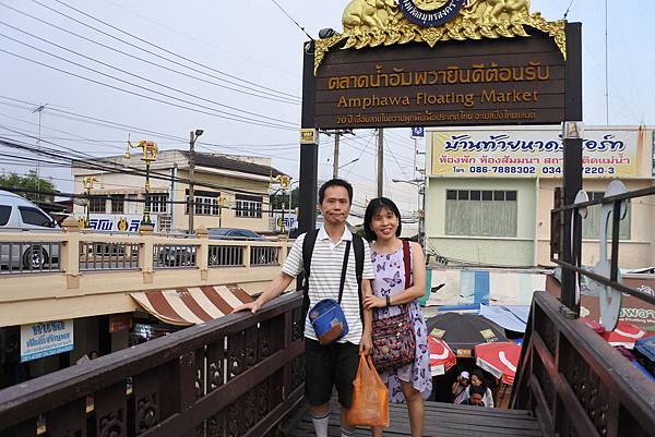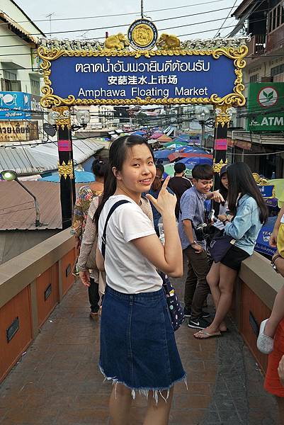 遊船後我們才開始逛安帕瓦水上市場,橫跨市場兩端的行人橋,英文招牌的這座橋人少很多。