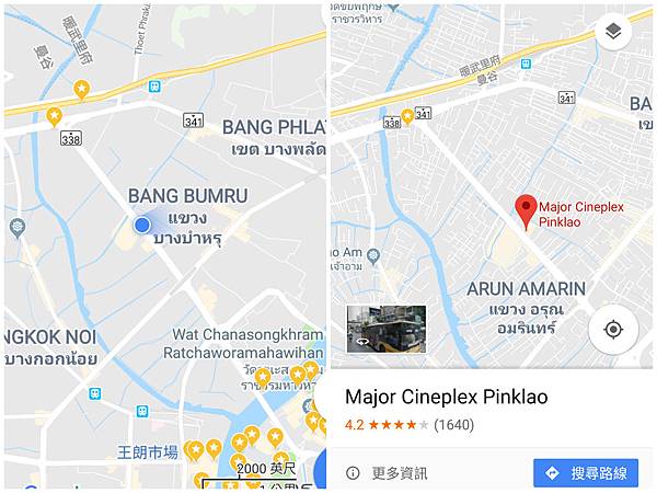 結果實際搭乘費用才฿100!還好沒選擇到N12碼頭再搭船還要再走路浪費時間。回來後把當時定位的截圖查了一下Google街景,才知這個購物商場是Major Cineplex Pinklao。