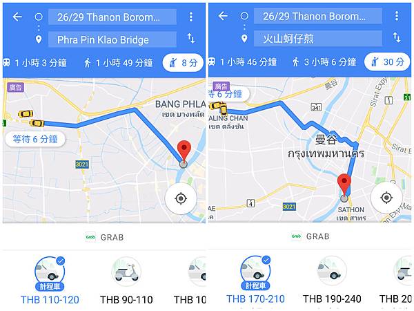 實際搭乘幾次的經驗,我發覺大部分都比Google預估的費用還便宜!像這一次從Mini Van下車的地方搭計程車到石龍軍路上的火山蚵子煎,Grab預估฿170-210,讓我幾乎想改到N12的Phra Pin Klao Bridge(฿110-120)搭橘旗船回到Saphan Taksin或許比較省錢吧?