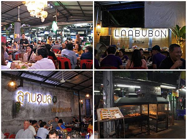 這家Laab Ubon是幾乎只有本地人才會來的平價大排檔, 有各式燒烤和熱炒。一開始看到餐廳外面正在燒烤的濃煙有點嚇到,想說衣服頭髮都要完蛋了!但半開放的偌大空間,我們竟沒有被濃濃的煙燻的感覺耶! 好加在!