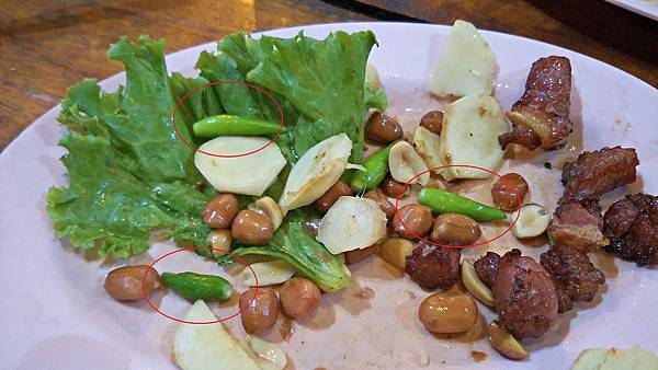 下面這張照片的綠色小小的看似豆子的食材,我以為是切段的四季豆,咬了下去才發現是辣椒,而且非常~非常~非常~辣!辣到我整個嘴巴都要燒起來,幾乎快哭了,喝了一堆水,後來乾脆含冰塊!很久很久才退燒!這真是我這輩子吃過最辣的辣椒!