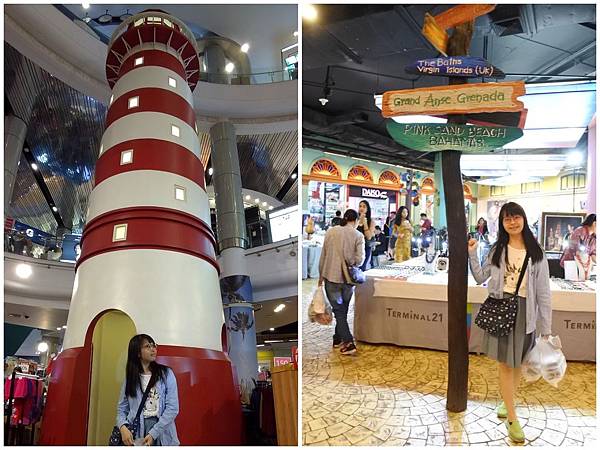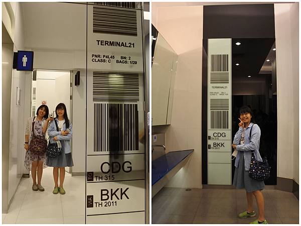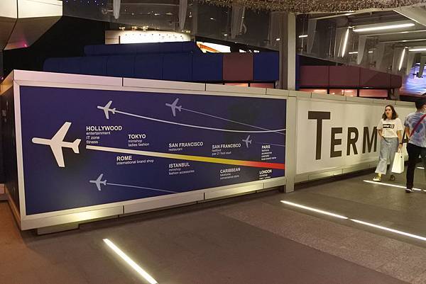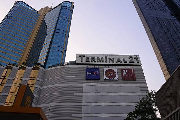 Terminal 21以環遊世界為主題的購物中心,商場的手扶梯都設計成「登機門」的意象,通過手扶梯到一個樓層,就彷彿搭乘飛機通往另一個國度,整個樓層也搭配各國特色,營造不同的主題,連廁所也是以各國的主題來設計的。
