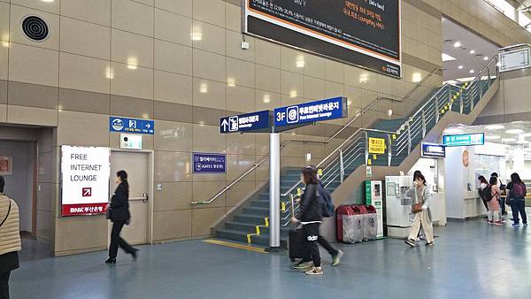 釜山金海機場不大,出境後就是一整排登機口,在4號登機口附近,往3樓貴賓室的樓梯剛好就在退稅櫃檯的上面。