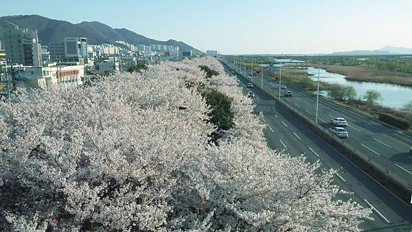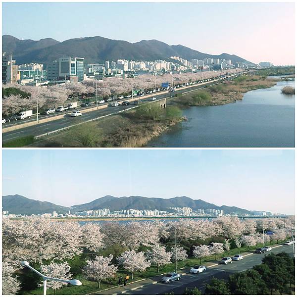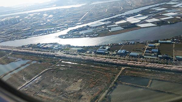 飛機即將降落釜山金海機場前,我們在機上鳥瞰江邊公園一整排的櫻花大道~好興奮呀!,真是壯觀極了!
