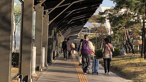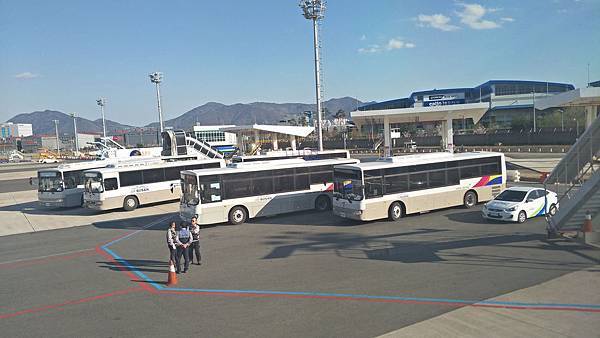 已經很多輛接駁車在等候接送乘客到航廈