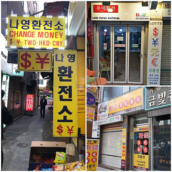 西面7號出口這附近就有4家換錢所,出地鐵站後直走第一個路口星巴克左轉直走,到三叉路口走右邊的路,這一條路就是著名的豬肉湯飯街,走沒多久就看到會看到首爾換錢所(서울환전소),當天沒開,我本來要從旁邊的巷子穿過去到大馬路上找樂天換錢所(롯데환전),沒想到就看到那英換錢所(나영환전소)了,也有人說是老爺爺換錢所。那個老爺爺還有跟我比了一下隔壁的老奶奶換錢所(서울환전소),但當天沒有營業。一走出巷口就是樂天換錢所,這4家換錢所根本就是連在一起的。
