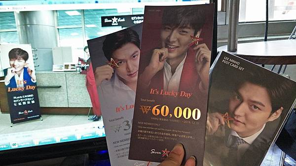 本來查到的都是憑券入會送3萬₩,現場看到是6萬₩(5萬₩籌碼、1萬₩是吃角子機券)超興奮!還有明信片喔!看了社團分享可以1人賭大、1人睹小,幾乎就可以現賺5萬₩!不過後來老公堅持不要去,他說公務員進賭場是涉足不當場所....,所以這張我就只能帶回家紀念了...。