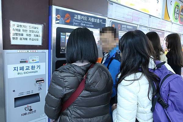 我們只有1萬₩大鈔,想儲值5000₩就好,但儲值機不提供找零,得先用旁邊那台換鈔機把大鈔換開。結果換鈔機只能換5張1000₩,不能換2張5000₩,然後儲值時還要一張一張送,又有4張卡...真的是超浪費時間,早知道應該要在便利商店儲值就好。