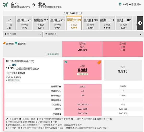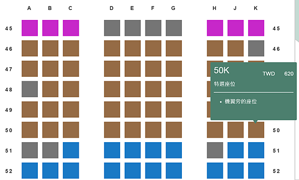 但訂票隔天東南寄來兒子選位後的行程表,來回都幫兒子先預選靠走道座位了,但有註明「或您也可在出發前上航空公司官網自行更換」。兒子去程是Plus票價規則本來就可以免費選位我知道,不過我想說因女兒不能選位,還不如出發前48小時內網路報到兩人再一起選位,還比較有機會坐在一起。但兒子回程跟女兒一樣也是Standard,怎麼來回都可以選位呢?上了長榮官網一看,原來Standard也可以免費選位,51排之後的標準座位,但Plus可以選更前面一點的、46-50排的特選座位,要價620元耶!可惜為了陪妹妹坐,也只能放棄了QQ