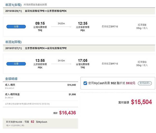 這次訂機票才注意到,原來東南有回饋金My Cash的機制,之前買巴黎機票,加上幫同仁訂機票,每200元可換1點,竟然也累積了932點回饋金,1點可折抵1元,可折將近1000元!實付15504元,很有感,但還是不便宜呀!