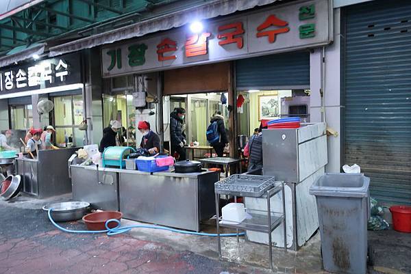 換完錢回到豬肉湯飯街,之前在社團看到有人po松亭豬肉湯飯的碗都會在湯裡面洗過,看了有點可怕,所以先排了機張刀削麵(기장손칼국수)。都在同一條街上,不過後來我們經過浦項豬肉湯飯(포항돼지국밥)看到他們並沒有這樣做,所以我們後面幾天也有再來吃,這部分後面再來分享,先跳過。