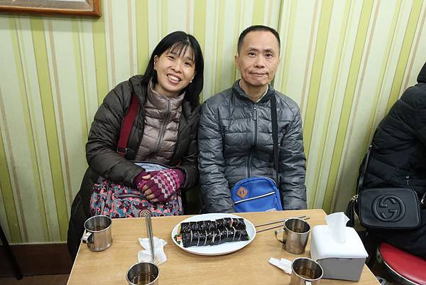 我們可以點一碗刀削麵5000₩和一份(條)海苔飯捲1500₩就好。夫妻倆6500₩搞定一餐,真的是超省錢的,哈哈!照片的飯捲是2份,我們兩對夫妻都點一樣。