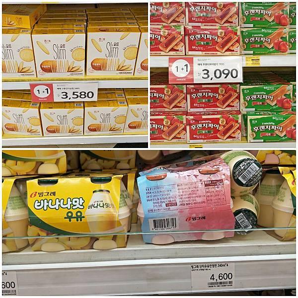 整體來說,我覺得Homeplus的餅乾比較便宜,很多買一送一,還有均一價1000₩,真的很便宜,很後悔沒多買一點!還有香蕉/草莓牛奶,也比便利商店1400₩便宜一點,大概是草莓牛奶比較沒人買,一組還多送2瓶香蕉牛奶,將近便利商店的半價了!