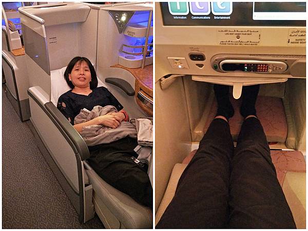 第一段台北到杜拜航程我們全家都被免費升等阿聯酋A380雙層中巴士商務艙,體驗從來不敢奢求在飛機上平躺的飛行享受!頓時覺得就像從地獄來到天堂!出發前流的辛酸血淚都值得了!!就算理賠不到全額,就當做是自己花錢升等吧!若還能理賠到,那就算中大獎了吧!