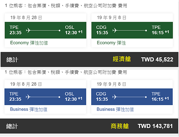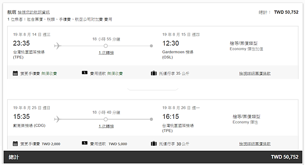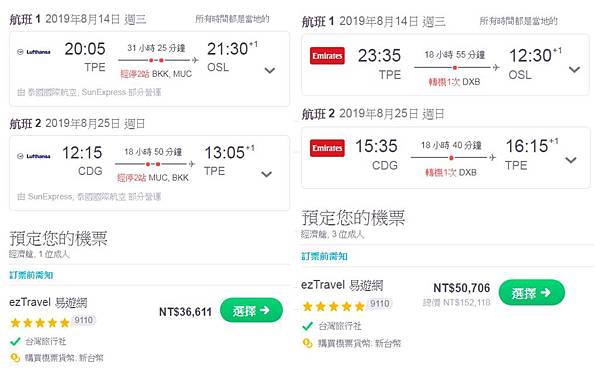 先查台北巴黎,但都無法順利銜接我原本的巴黎飛奧斯陸航班;又可能失接飛奧斯陸航班,也查巴黎奧斯陸航班,但都得在巴黎機場過夜。這樣我還不如直接轉機去奧斯陸,不要先去巴黎了,再查台北奧斯陸的機票,扣掉沒有台胞證不能去大陸轉機的陸籍航空,能選擇的就只剩轉機2次、耗時31小時、3萬6的漢莎航空,以及轉機1次、只要18小時、但要價5萬的阿聯酋航空。