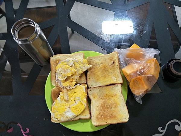 這樣4片土司佐韓亞航機餐餐帶下來的奶油,再夾2個荷包蛋,配上1杯咖啡牛奶,還有2個南大門市場買的甜柿,可就讓我從早餐吃到午餐了,哈哈!