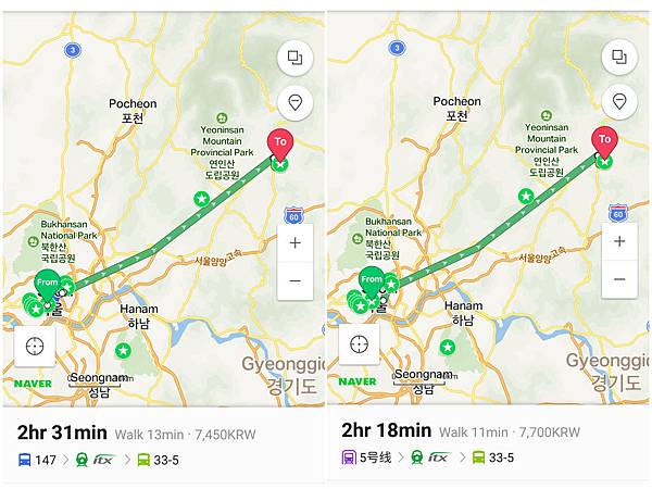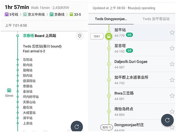 用Naver地圖查地鐵路線就出發了,先到上鳳站再轉京春線到加平站,再轉33-5公車,將近2小時車程,不過刷T-money卡都可以享有地鐵和公車轉乘優惠,全程只要2450₩。