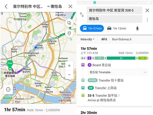 從首爾到南怡島,很多人會選擇搭ITX青春列車,從清涼里到加平搭ITX青春列車則只要38分鐘,票價4800₩(另外也可以在龍山、往十里站或上鳳站搭乘,後者停靠班次較多,依起站不同價格亦不同),不過再加上轉乘時間(如下圖),預估車程還超過2小時,且因為ITX不能用T-money卡,得另外購票,所以前後的地鐵和公車都不能享有轉乘優惠,以我出發的青丘站搭地鐵來說,車資就要7700₩!
