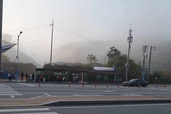 往南怡島的一般公車站是在對向車道,已經有不少人在等公車了。