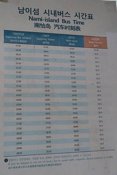 往南怡島的公車,第一班是7:45,再來是8:45,之後就差不多30分鐘一班了。