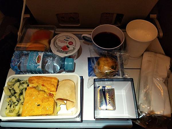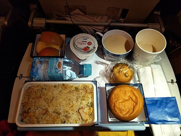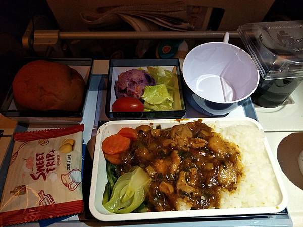 起飛不久就上餐了,但燈光實在太昏暗,我們還得開小燈用餐,看一下時間才上午8點半左右。