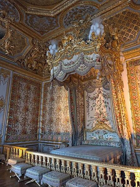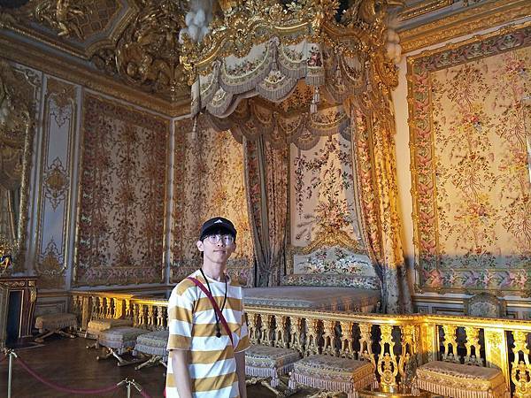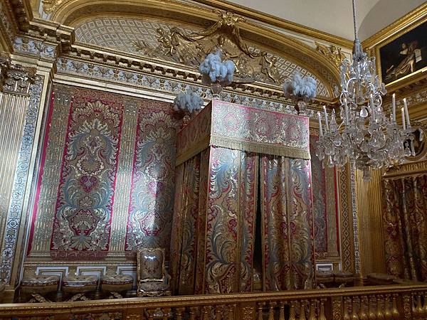 國王寢宮內以金色和紅色為主的色調,彰顯皇家的貴氣。有金紅織錦大床和繡花床簾,床簾上方裝飾鳥的羽毛,圍以鍍金護欄,我本以為那是後來為了展示而加裝的,沒想到這是原本就存在的欄杆劃定了國王的私人空間,極少人可以進入其中,是宮中最神聖的空間。從路易十四以來,都是在這裡舉行起床、問安和就寢等儀式。
