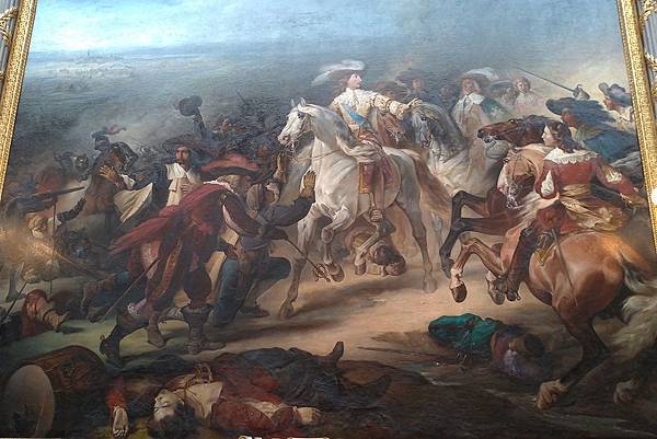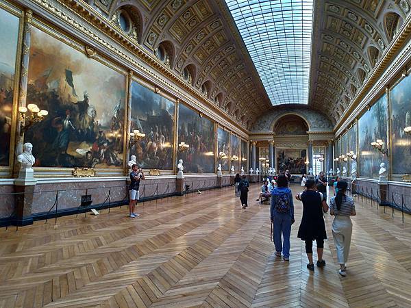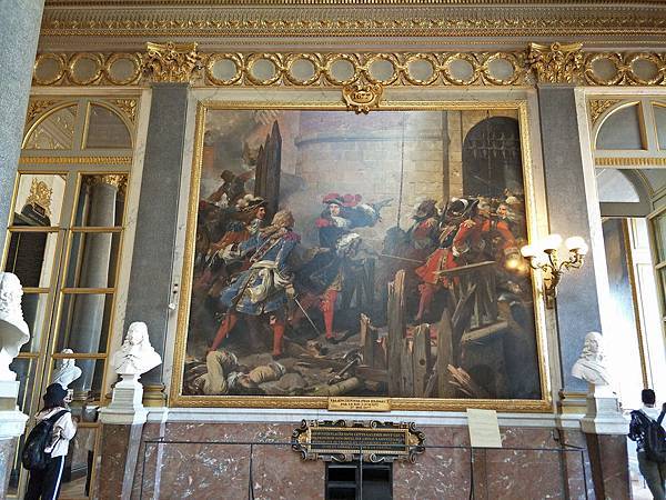 1837年路易•菲利普時期落成的戰爭廊,匯集了三十三幅自西元496年的托爾比亞克戰役(Tolbiac)至1809年的瓦格拉姆戰役(Wagram)法國歷史上的重大戰役的油畫,歷經了所有統治過法國的王朝:墨洛溫王朝、加洛林王朝、卡佩王朝、瓦盧瓦王朝、波旁王朝,還有法國大革命和拿破崙一世,用來彰顯「法國榮耀」的意涵:法國是歷經無數次內、外部戰爭建成的,自今往後的法國將是輝煌而穩定的,且已準備好踏入和平與繁榮的新紀元。
