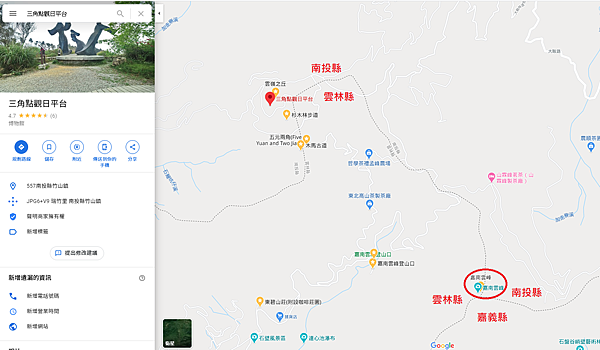 不過我是很懷疑啦!Google地圖顯示雲嶺之丘的地理位置,根本只有雲林和南投交會,三縣交會處應該是在下方的嘉南雲峰。