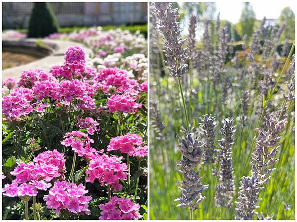 從出口遙望大門柱廊(Le Péristyle)和井然有序的花園,值得一提的是這些成千上萬的花卉是種在花盆中,然後再埋在花壇中,以便隨時進行更換。