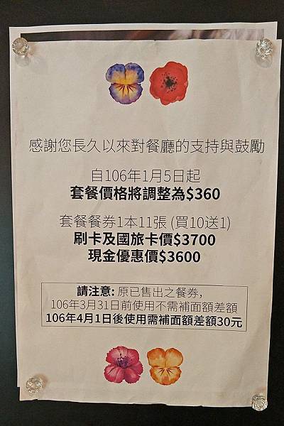 以前1客330元,現在漲到360元,買10張餐券還加送1張,不過刷國旅卡還要加價100元,平均1張是336元,我覺得省不多(只省260元而已)。