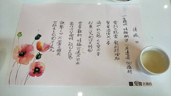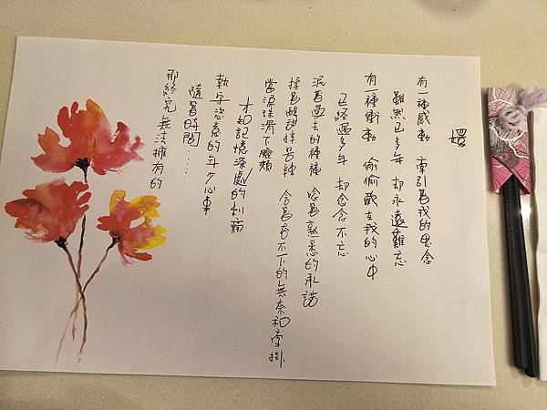 餐具和餐墊紙很優雅,餐墊紙還有手寫詩篇。