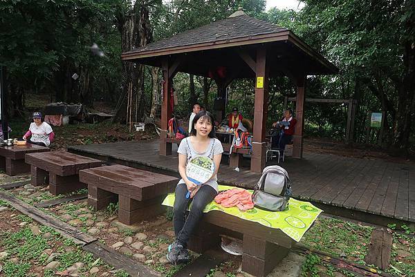 涼亭下方已座無虛席,我們只能坐涼亭外面的休閒椅,不過前日大雨椅子還有點小積水,還好我們有隨身攜帶野餐墊,鋪在上頭, 舒適到差點讓我想躺下來小睡一下說XDD