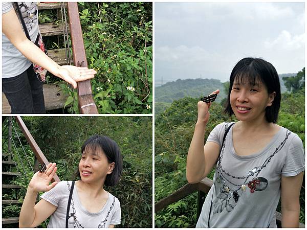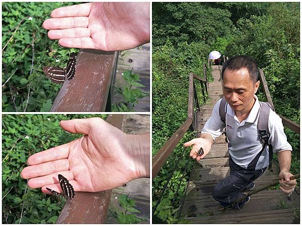 離去前在步道欄杆附近看到一些飛舞的蝴蝶,我們沒有抓牠喔!我們只把手親親靠近牠,牠就自己跳上我們的手掌了!