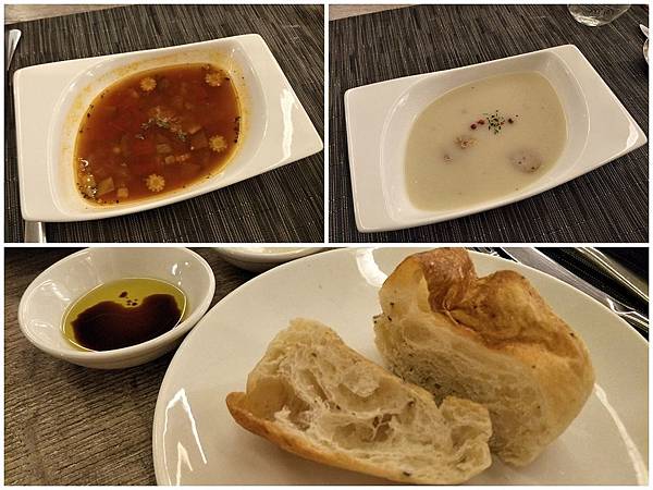 湯品有兩種選擇,蘑菇濃湯和番茄牛肉湯;法式長棍麵包佐橄欖醋,麵包可以再續,不過我們真的不太習慣橄欖醋...。