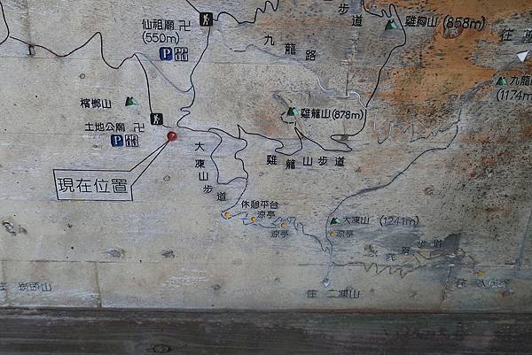 關子嶺大凍山海拔1241公尺,是台南的第一高峰,也是台灣的小百岳,一般自紫雲殿仙祖廟停車場起走,登頂單程5.1K,若再續行開車至上方土地公廟,單程只要3K,只是往土地公廟的路不好會車,而且停車位少,所以就跟朋友約在紫雲殿仙祖廟停車場碰面。