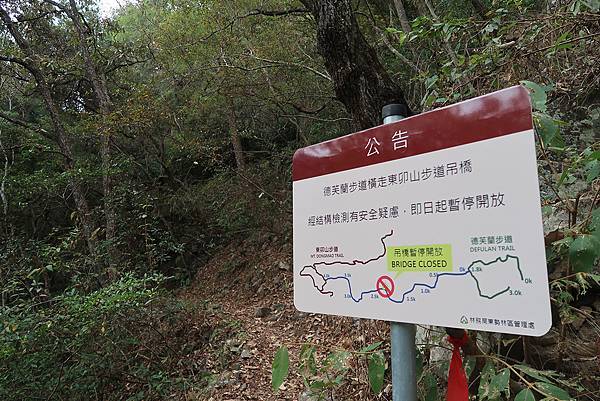 離出口1.3K處就是往東卯山步道的聯絡道,不過因中間吊橋結構有安全疑慮,已經暫時封閉不能通行喔!